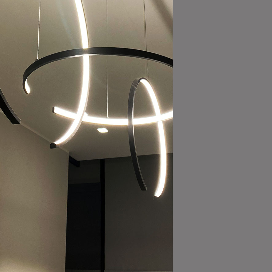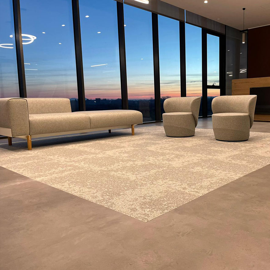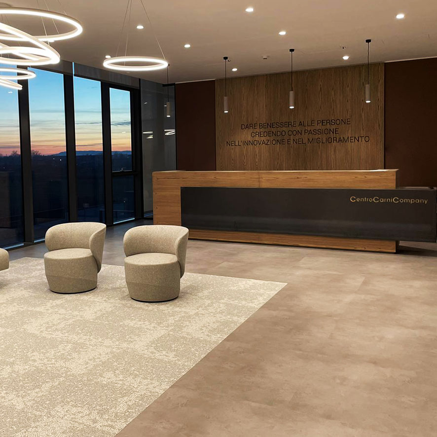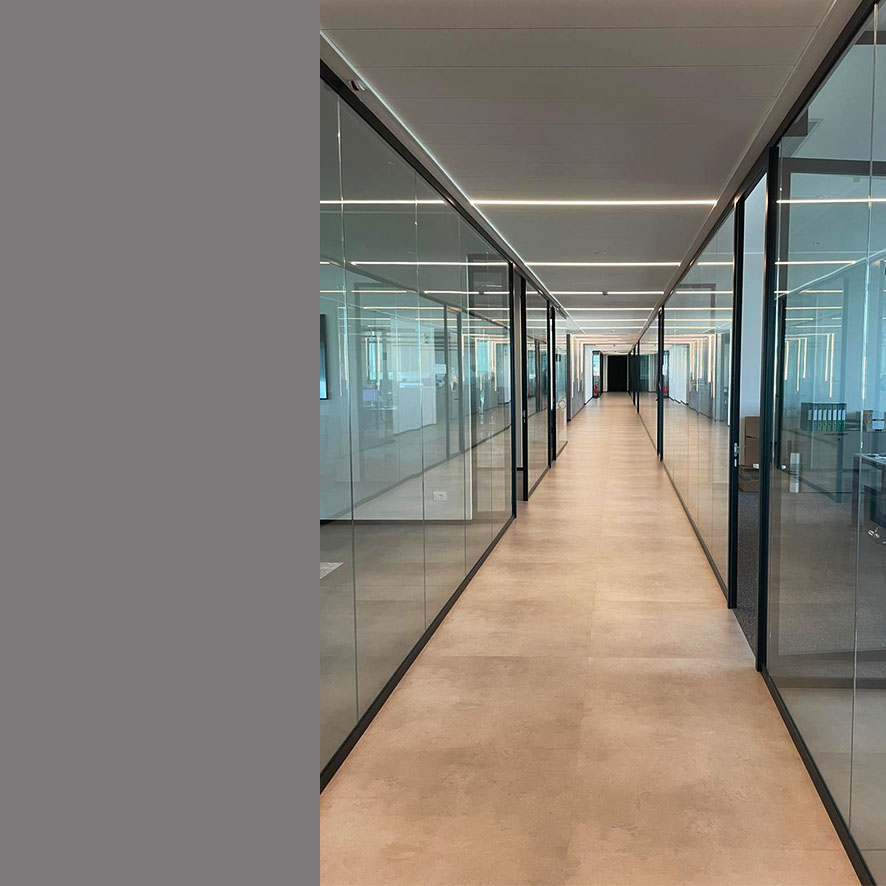 Operations: Realization of partition walls in glass and plasterboard, raised floor carpet, stair cladding and stair rails in glass and steel, supply and installation of furniture